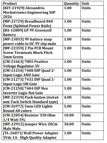 Complete electronics and logic training kit for Alexandria University Mechatronics SSP 2026 students. Includes breadboard, logic ICs, LEDs, power module & more—ideal for hands-on digital circuit learning.