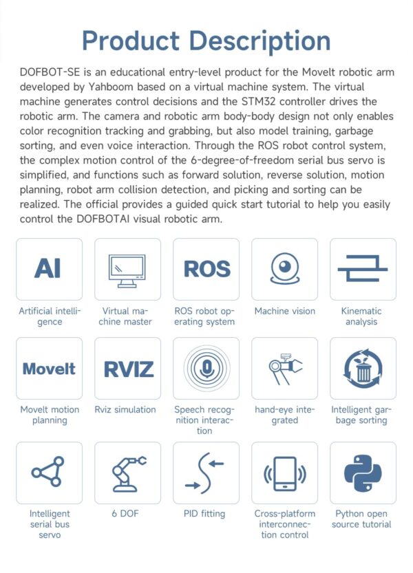 Whether you’re exploring AI-driven robotics or developing industrial automation solutions, the DOFBOT SE AI Vision Robotic Arm provides the power, precision, and intelligence you need.